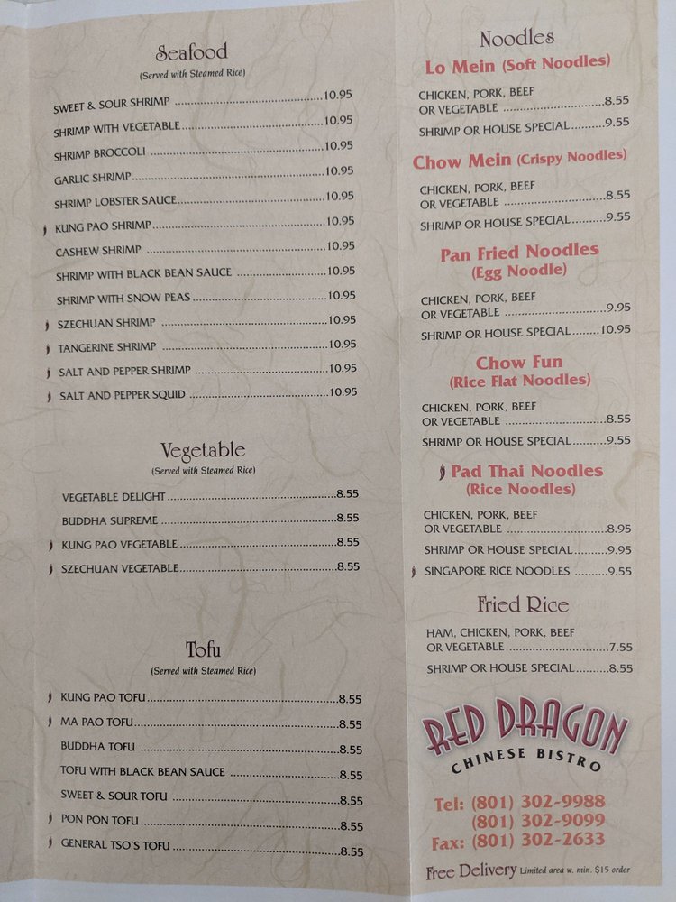 Red Dragon Chinese Bistro, located in South Jordan, UT, is a hidden gem offering a blend of Cantonese and Szechuan cuisine. This casual spot provides delivery, takeout, and catering services with vegetarian options available. Customers praise the friendly staff and delicious dishes like Pon-pon chicken and hot and sour soup. The menu features tempting appetizers like Paper Wrapped Chicken and BBQ Pork Cha Shu, along with savory entrees like Shrimp Fried Rice and House Special Chow Mein. With gender-neutral restrooms, Wi-Fi, and a variety of parking options, Red Dragon Chinese Bistro ensures a comfortable dining experience. Don't miss out on the walnut chicken or pon pon chicken with ham fried rice for a satisfying meal that exceeds expectations. Experience the delightful flavors and excellent service at Red Dragon Chinese Bistro today!